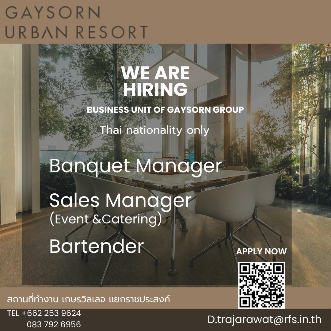 Gaysorn Urban Resort มีความประสงค์เปิดรับสมัครบุคลากร เพื่อร่วมงานในตำแหน่งต่าง ๆ ณ สถานที่ปฏิบัติงานศูนย์การค้าเกษรวิลเลจ (แยกราชประสงค์)...
