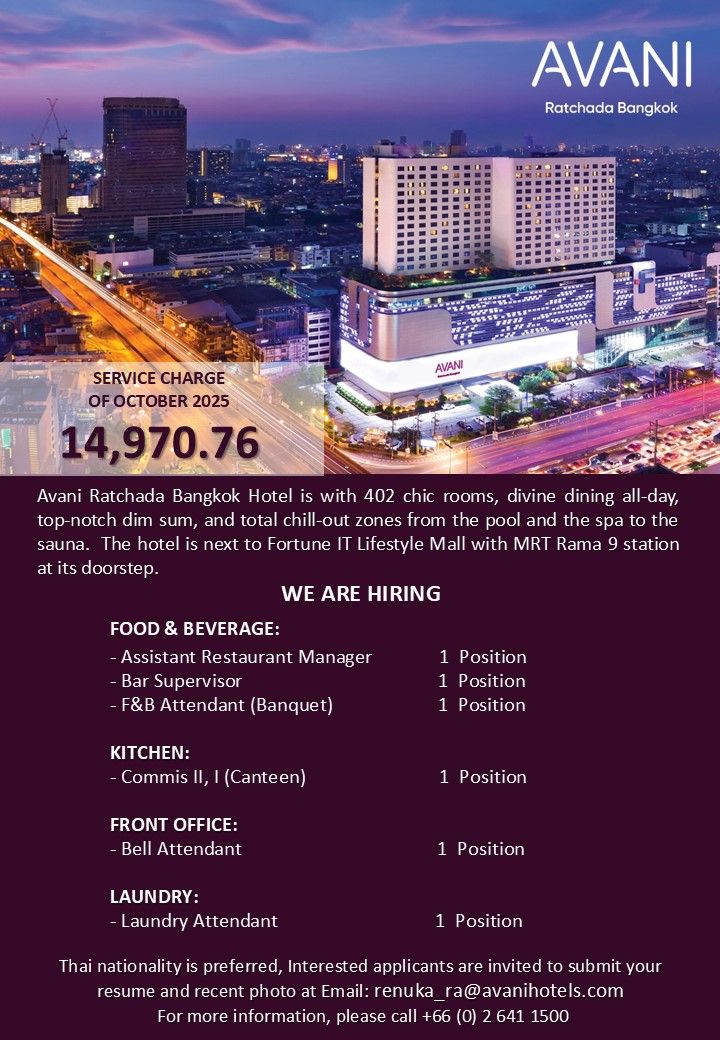 อ่านต่อAvani Ratchada Bangkok โรงแรมอวานี รัชดา กรุงเทพฯ #สถานที่ทำงาน #ทำเลดีอยู่ติดรถไฟฟ้า MRT สถานีพระราม9 #ใจกลางเมือง #เดินทางสะดวกมาก #มีที่จอดรถ #เปิดรับสมัครงาน