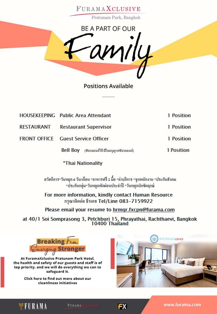 โรงแรมฟูราม่าเอ็กคลูซีฟ ประตูน้ำ ปาร์ค ซอยเพชรบุรี 15 BTSราชเทวี/พญาไท AirportLinkราชปรารภ ***ตำแหน่งงานว่าง 12/12/2025***...