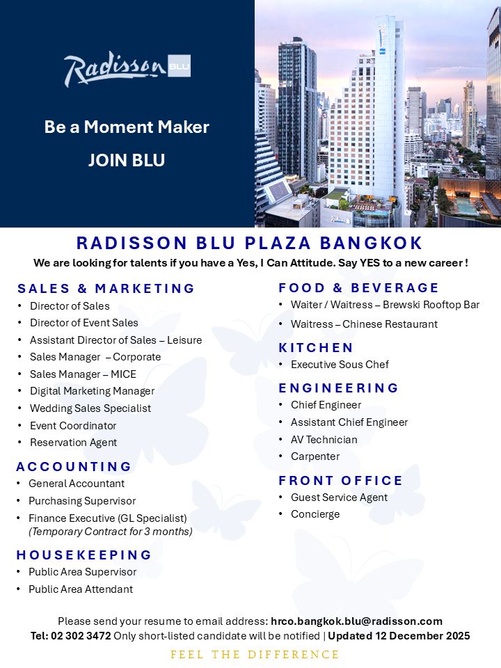 Radisson Blu Plaza Bangkok is looking for experienced candidates....