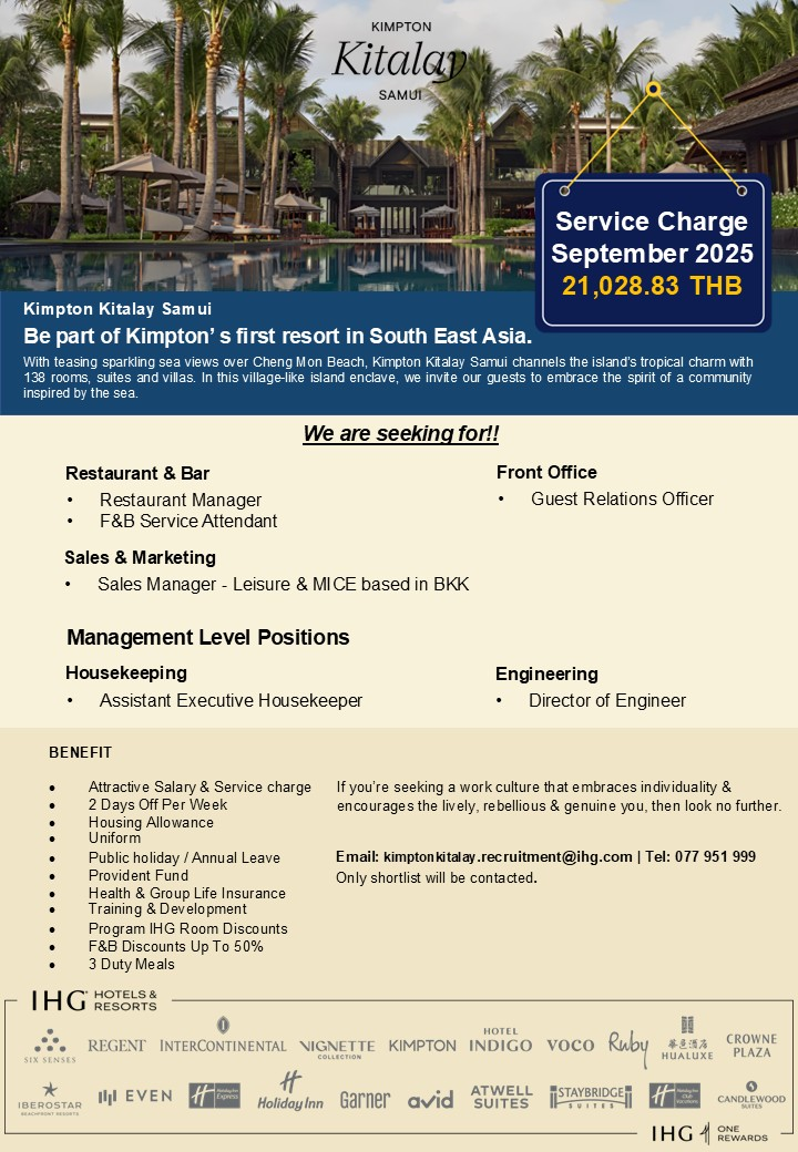 ร่วมเป็นส่วนหนึ่งของทีมเพื่อสร้างประสบการณ์การทำงานและวัฒนธรรมองค์กรในแบบของคิมป์ตัน คีตาเล สมุย ☺️🌴