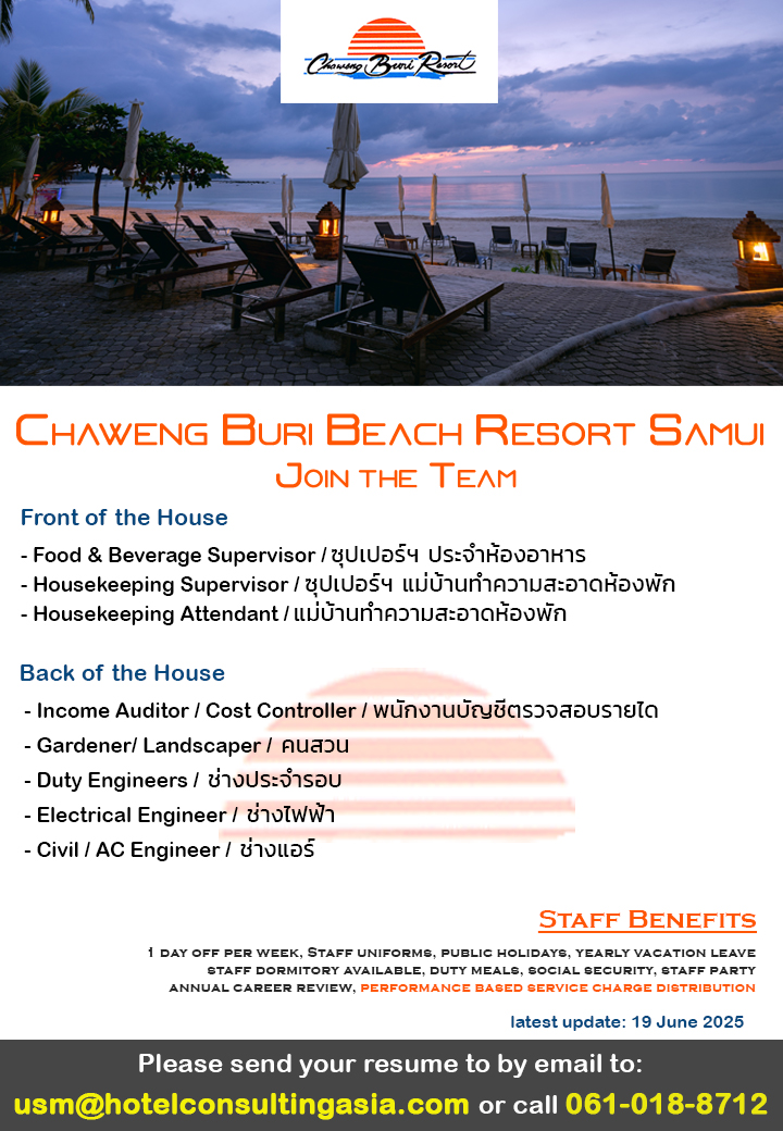 อ่านต่อWe are still hiring staff at the Chaweng Buri Resort Samui, please apply by email, phone or in person at the resort