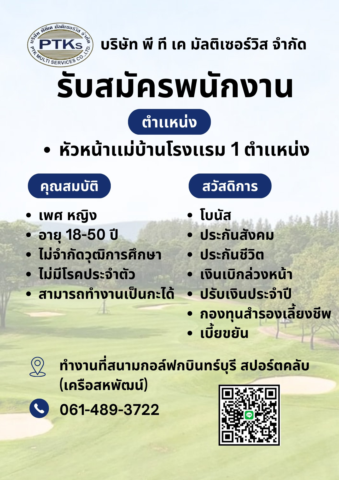 สนามกอล์ฟ กบินทร์บุรี สปอร์ตคลับ – Kbsc จ.ปราจีนบุรี 📌📌รับสมัครพนักงานด่วนนนน📌📌 👩🏻💼👩🏻💼ตำแหน่ง หัวหน้าแม่บ้านโรงแรม...