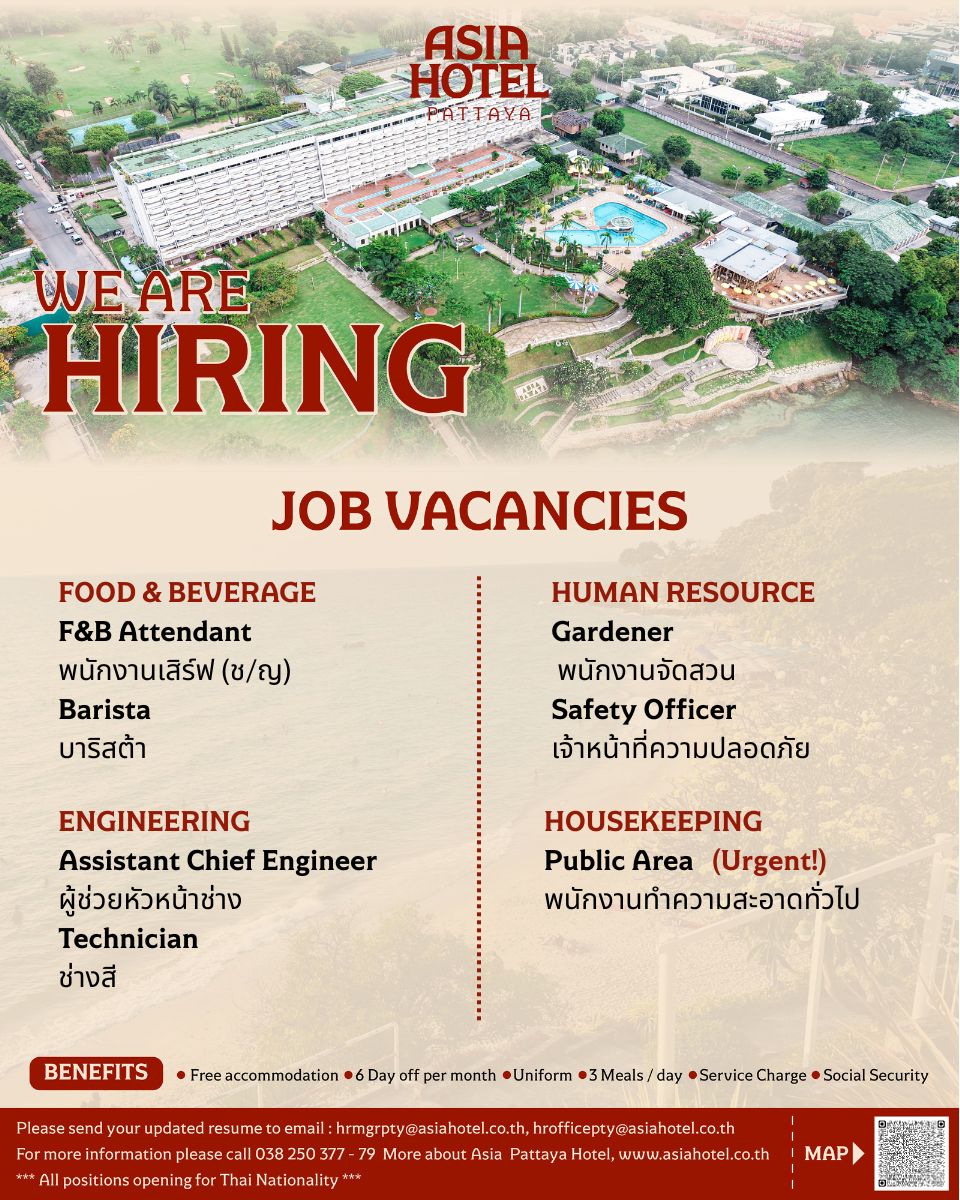 โรงแรมเอเชีย พัทยา ตั้งอยู่บนเขาพระตำหนักซอย 4 วิวทะเลสุดชิล เปิดรับสมัครหลายตำแหน่ง! Walk-in ได้เลย วันจันทร์–ศุกร์...