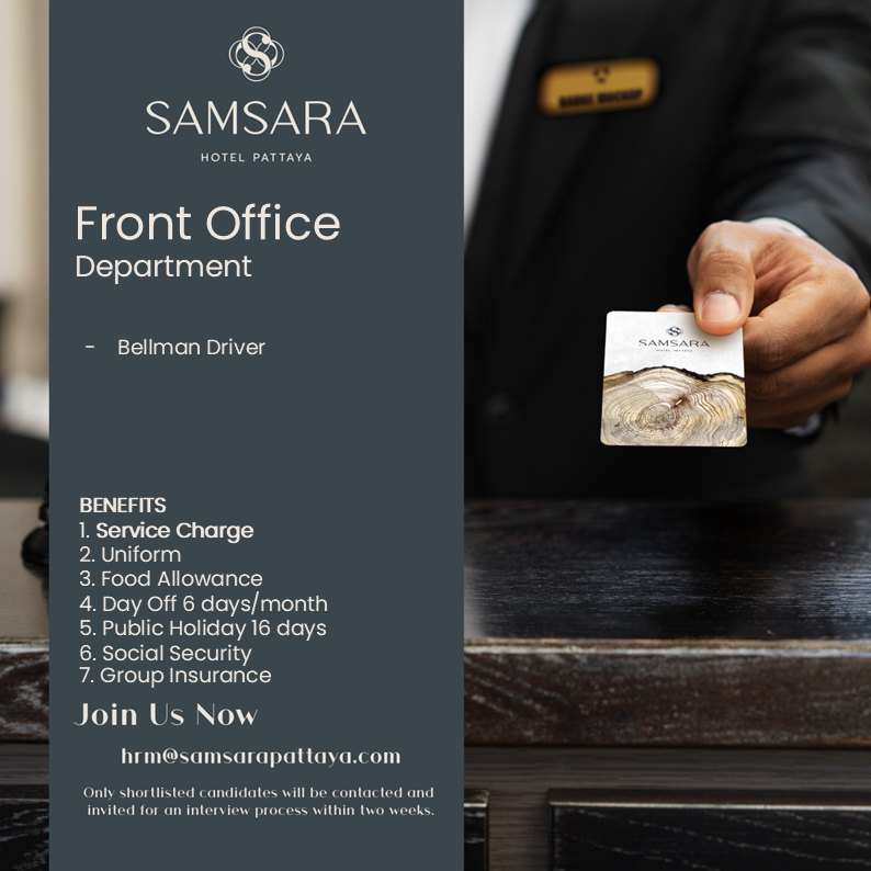 ประกาศรับสมัครงาน วันที่ 31/12/2568 Samsara Hotel Pattaya เปิดรับสมัครพนักงานโรงแรม เพื่อร่วมเป็นส่วนหนึ่งของทีมงานมืออาชีพ หากคุณมีประสบการณ์ด้านโรงแรม...