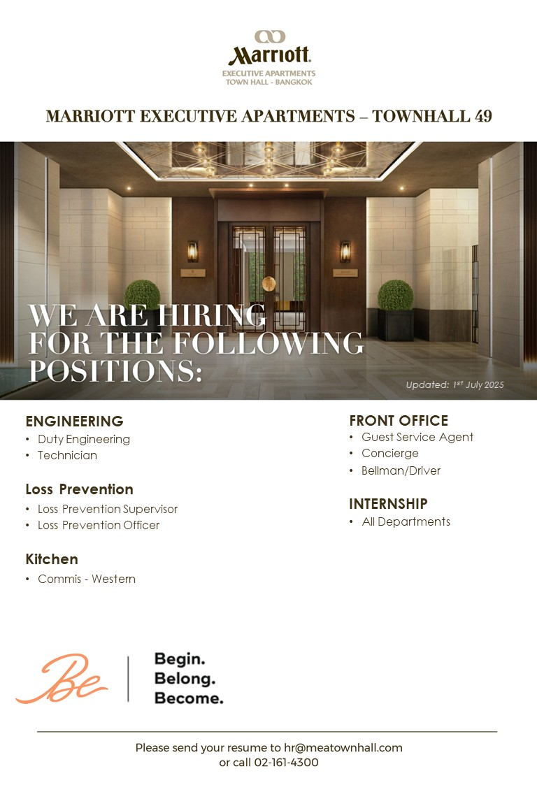 ประชาสัมพันธ์ตำแหน่งงานว่าง Marriott Executive Apartments, Bangkok Townhall Sukhumvit สนใจส่ง CV...