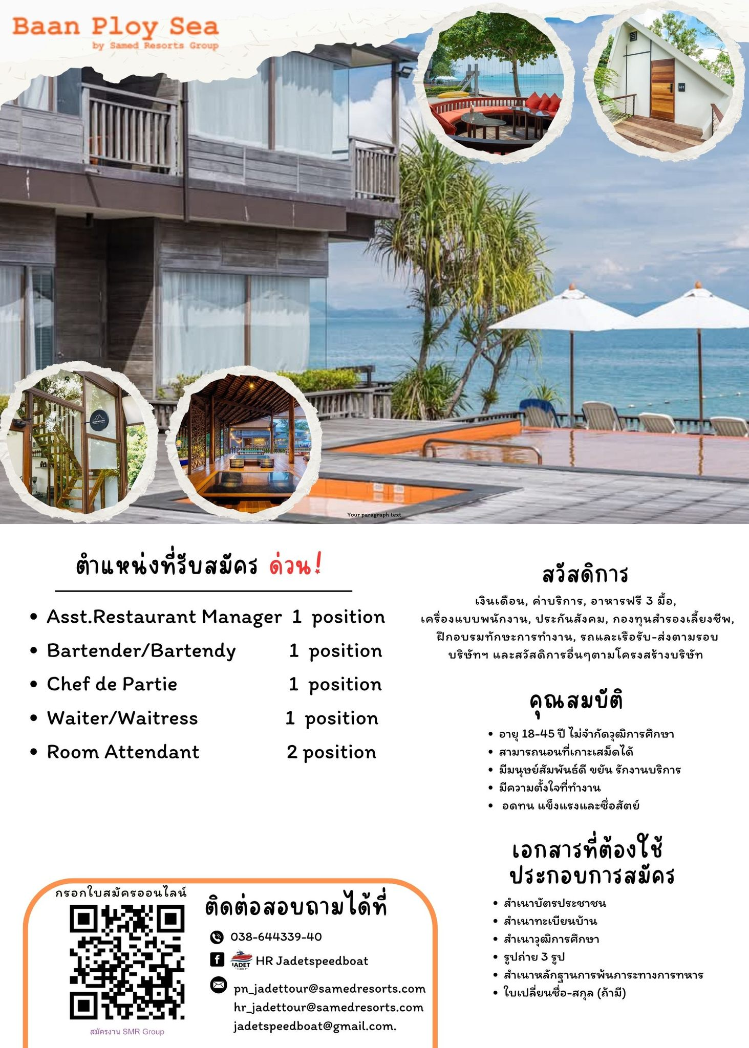 ตำแหน่งงานว่าง Baan Ploy Sea เกาะเสม็ด ระยอง Asst.Restaurant Manager 1...